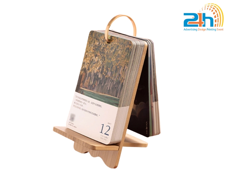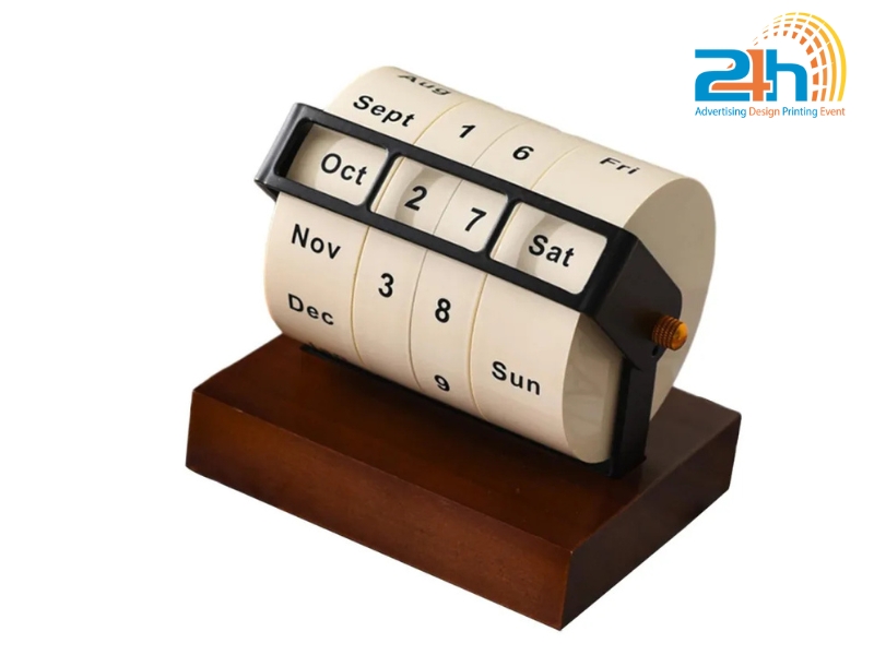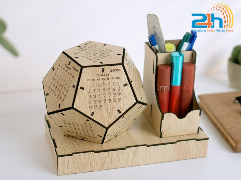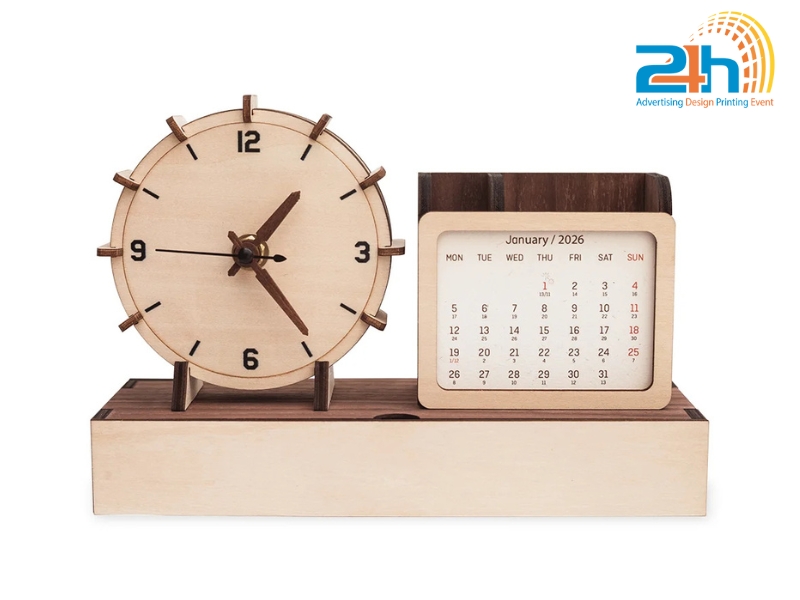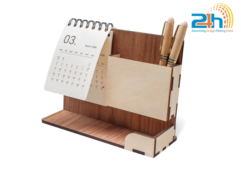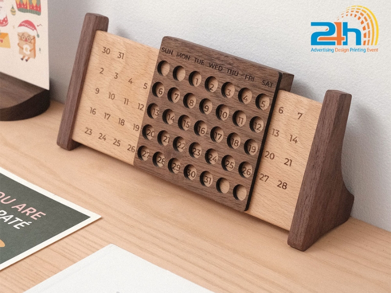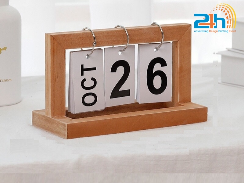Sản phẩm thường gồm các khối gỗ khắc số, thanh gỗ in tháng, hoặc dạng block thay ngày. Nhờ ưu điểm về tính thẩm mỹ và độ bền cao, lịch gỗ để bàn được nhiều doanh nghiệp lựa chọn làm quà tặng thương hiệu hoặc sử dụng để tăng sự tinh tế cho không gian làm việc.