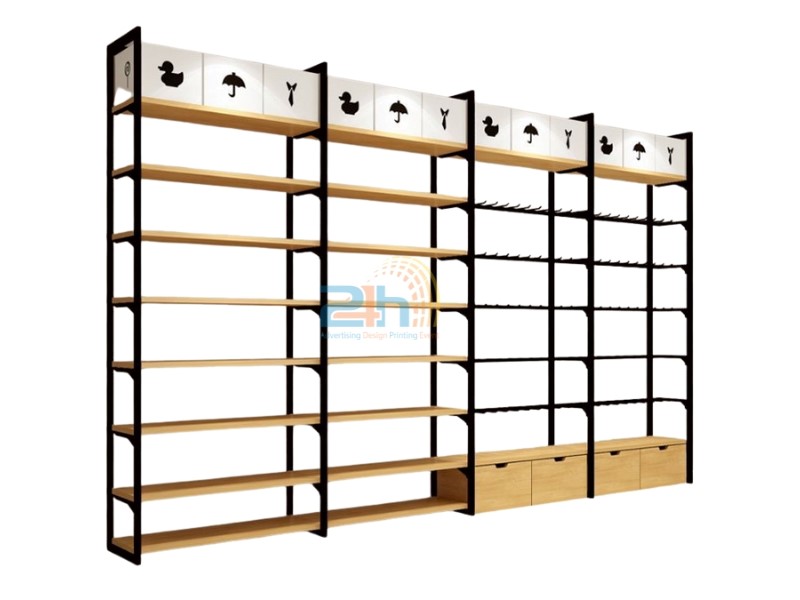 Thiết kế dạng tủ kệ giúp tận dụng tối đa không gian trưng bày với các ngăn và tầng rõ ràng. Khung sắt giúp tăng độ bền, trong khi bề mặt gỗ mang lại vẻ sang trọng và chuyên nghiệp. Đây là sự lựa chọn hoàn hảo cho các showroom trưng bày sản phẩm cao cấp như đồ gia dụng, quà tặng, hàng lưu niệm…