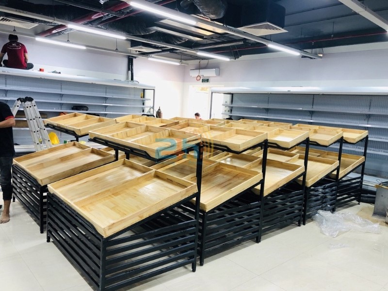 Dành riêng cho ngành hàng thực phẩm tươi, mẫu kệ này thiết kế mở, thoáng khí và thuận tiện trong việc vệ sinh. Gỗ tự nhiên hoặc gỗ công nghiệp cao cấp giúp bảo quản rau củ tốt hơn, tránh hấp hơi và ẩm mốc. Đồng thời, thiết kế thân thiện với môi trường còn là điểm cộng lớn trong xu hướng tiêu dùng xanh năm 2025.