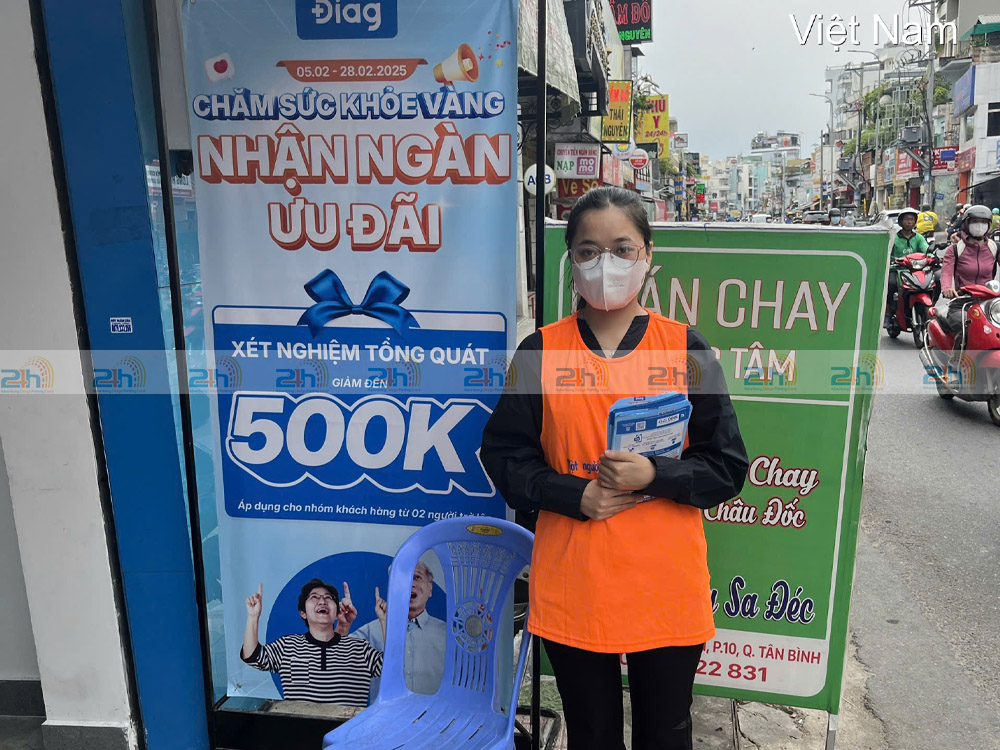 Trong dự án lần này, Hai Tư Giờ thực hiện phát tờ rơi giới thiệu dịch vụ xét nghiệm y tế chất lượng cao của DIAG đến cộng đồng. Chúng tôi bố trí đội ngũ nhân viên phát tờ rơi được đào tạo kỹ lưỡng, am hiểu thông tin cơ bản về dịch vụ, luôn làm việc với thái độ lịch sự, chuyên nghiệp và tận tâm.
